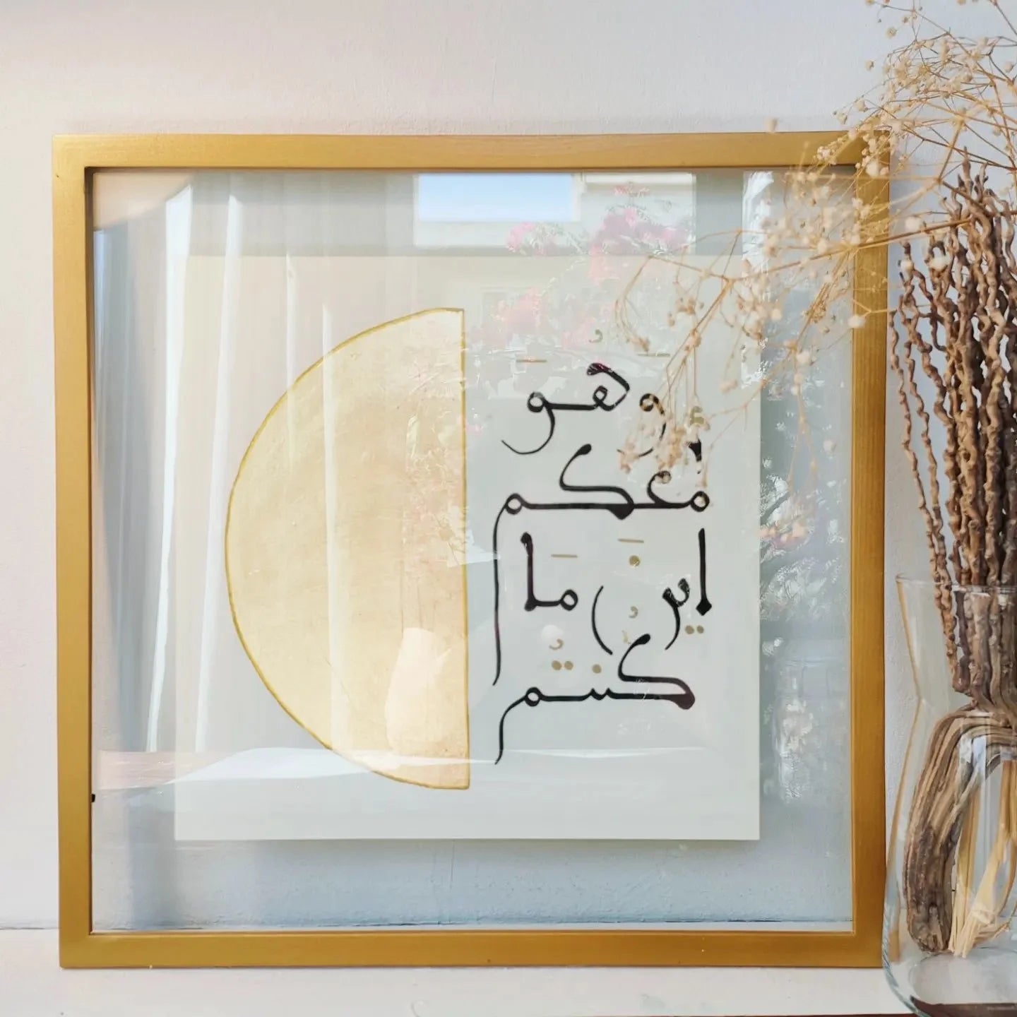 Black Moroccan hand calligraphy and gold leaf on cotton paper in a double glass frame.