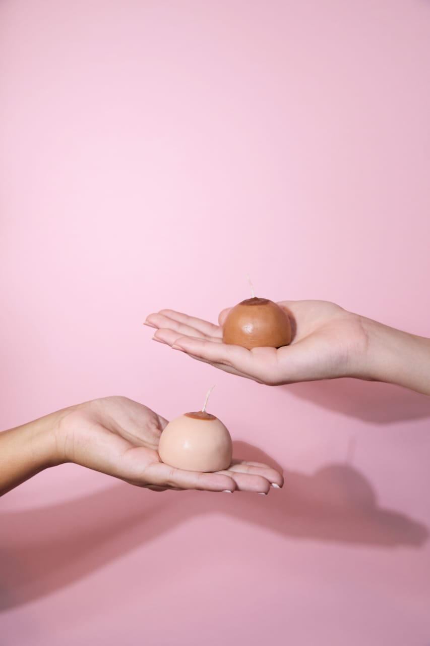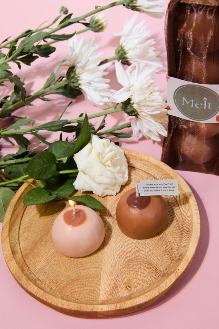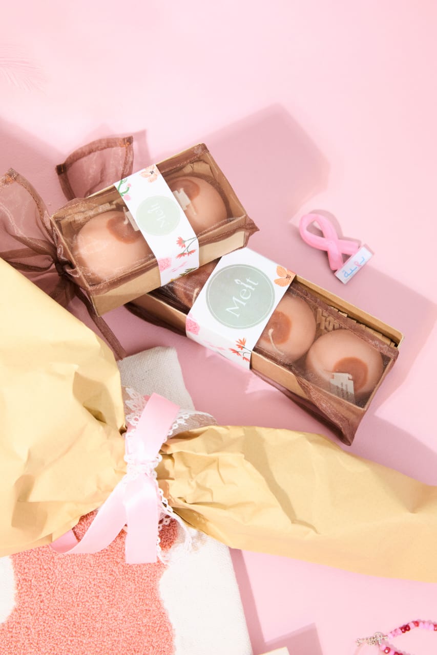 The Powerful Pair by Melt is a set of two breast-shaped candles in a tan skin tone, hand-poured with natural soy and beeswax blends, infused with a soft white musk scent and finished with cotton wicks. Created exclusively for the SHE Campaign’s Pink Pouch, each set helps raise awareness about breast cancer and contributes to funding early detection initiatives at Baheya Foundation.